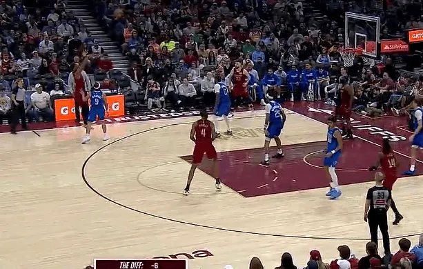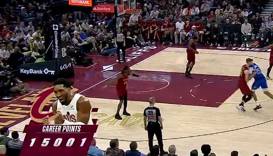比赛的第三节,米切尔不讲理干拔三分投进,生涯总得分突破15000分。